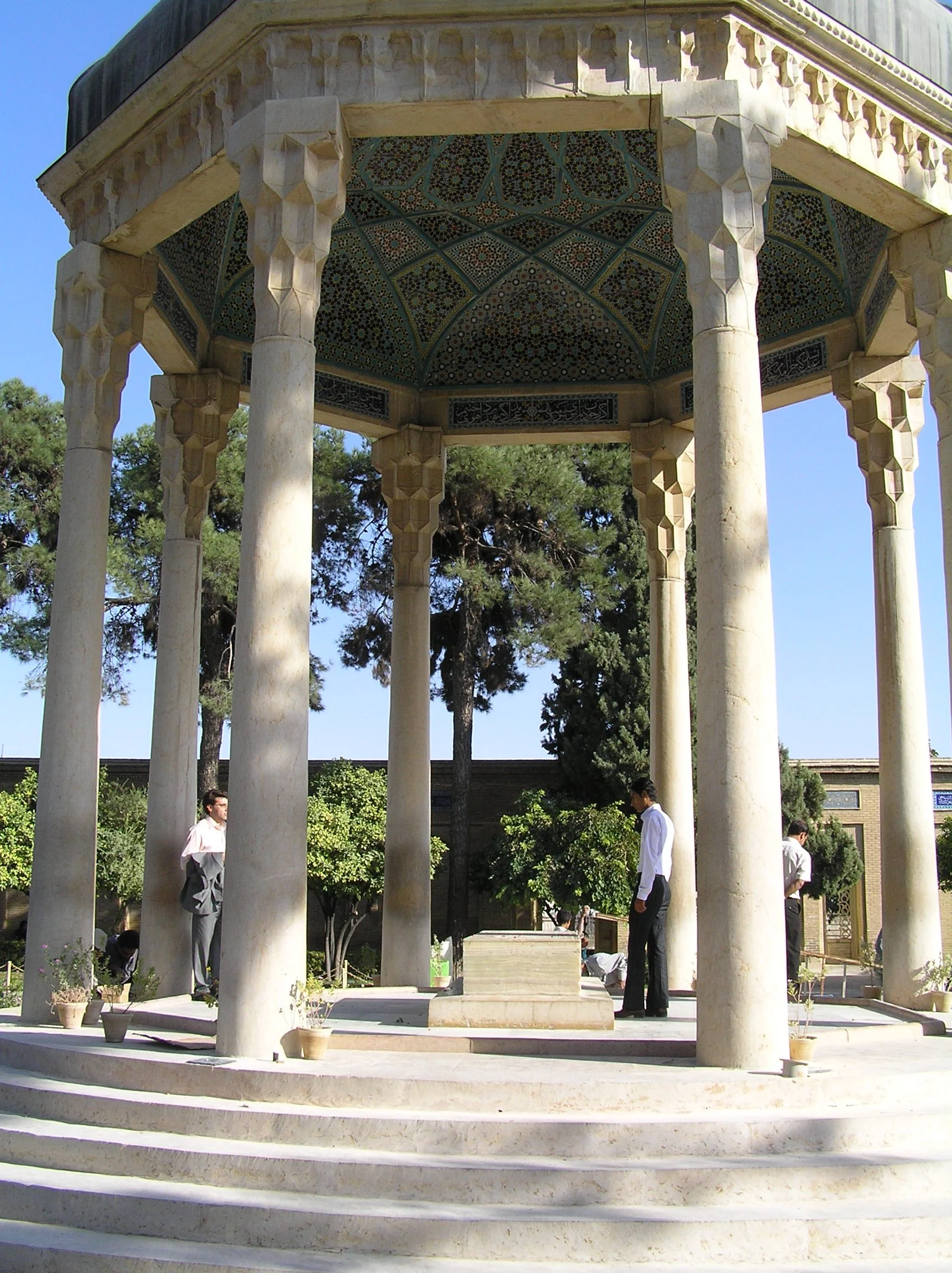 After another tremendous lunch (I'm enjoying our non-hotel meals much more), we made a stop at Hafez' tomb. The 14th century Persian poet is venerated and beloved here in Iran, and is part of the national cultural fabric that makes this place far more interesting than first meets the eye. A Shiite like most Iranians of the 14th century, Hafez could recite the Qur'an from memory (his name in Arabic means he who has memorized). Even so, his poetry was quite subversive. Wine is a frequent topic, as are women and love. He was also subtly satirical of religious authorities, but abstract enough to get away with it.