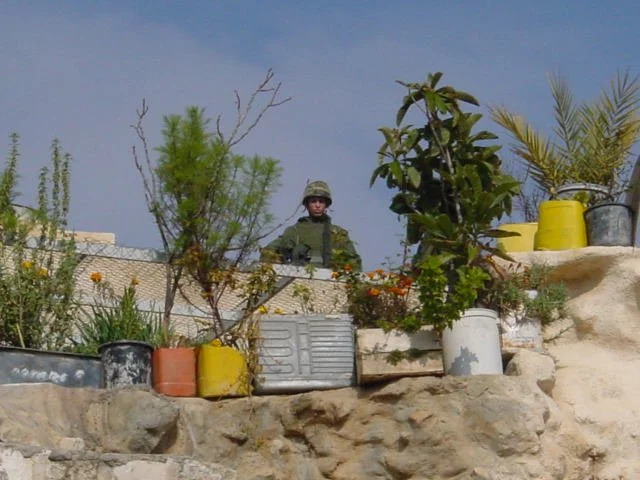An Israeli soldier on the roof of our home for the night with a Palestinian family in the Old City of Hebron