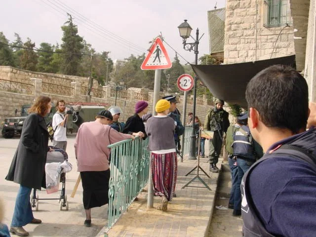 Just outside of the market, a group of five Israeli settler women were in effect holding the area hostage. Because of their presence, the soldiers would not let Palestinians pass through from the market across the town center. Marthame saw one woman throw a stone at the Palestinians hemmed into the market. Another taunted them and called the Westerners who were watching "Nazis." Elizabeth was the focus of her vitriol for a while (until a soldier was nice enough to push Elizabeth away).