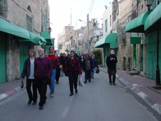Internationals in Palestine walking through the shuttered streets of Hebron due to curfew (which is only enforced on the Palestinians living there)