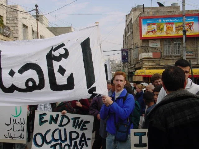 Marthame holding a banner as Internationals in Palestine show their solidarity with besieged Palestinians marching through the streets of Palestinian-controlled Hebron