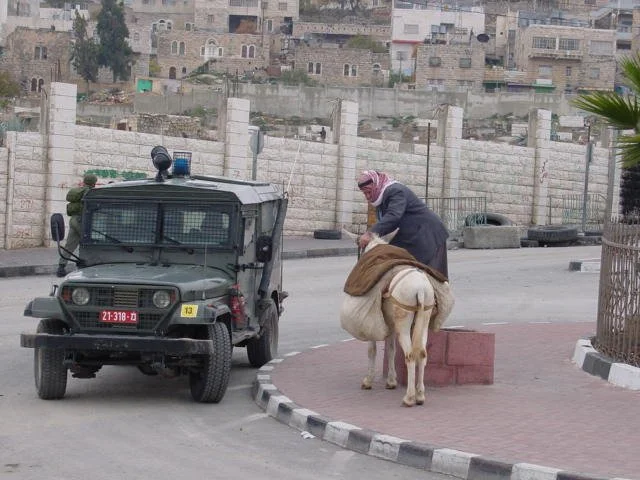A Palestinian man mounting his donkey next to an Israeli police jeep in Hebron
