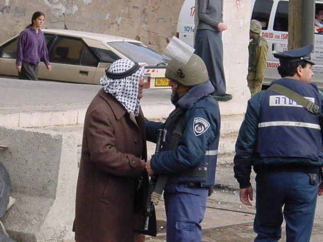 A Palestinian man speaks with an Israeli police officer in Hebron, Palestine