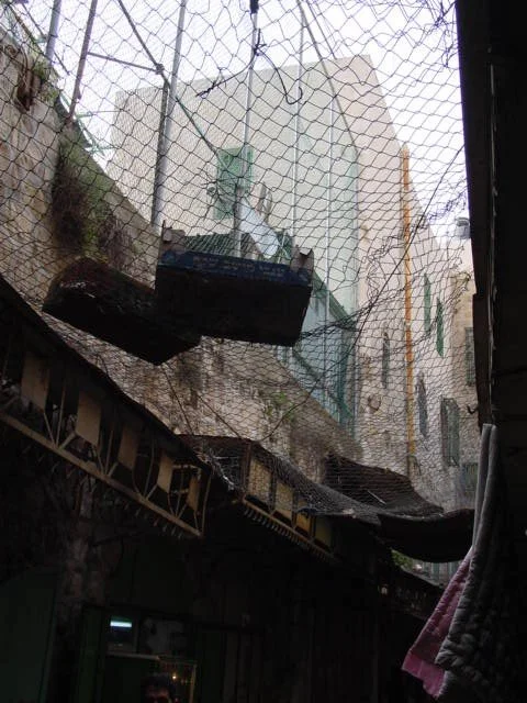 Chain link fencing above the Old City market in Hebron, keeping Israeli settler garbage at bay