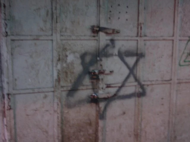 By the time we got back, curfew was in full-effect and only soldiers roamed the streets. The Old City was closed in with gates (one of the CPTers, when he saw them, said, "I haven't seen those in a while!"), and we noticed the Stars of David tagging Palestinian-owned shops - painted by settler youth marking "their territory". We joined the CPTers for dinner, interrupted by a phone call (their phones are their bloodline, and are also putting them into the red) that settlers were gathering again, shooting guns into the air, and headed off somewhere in the valley. We also heard that a settler bus had been hit with a bomb (no one injured, thank God), and our hearts sank with the seemingly unending news of violence.