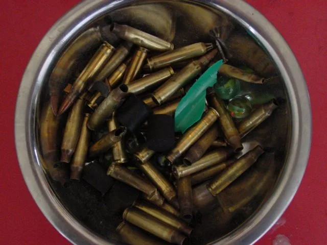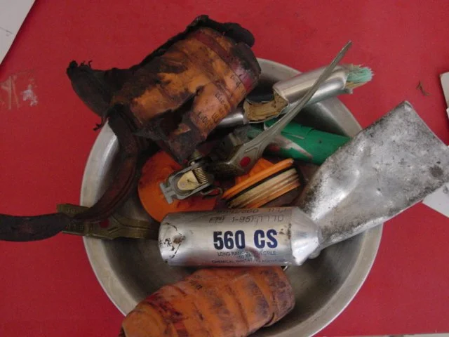 Our visit to Hebron was greatly facilitated by Christian Peacemaker Teams (CPT). A partnership of the Mennonites, Quakers, and Brethren, their non-violent message of "Getting in The Way" is taken quite literally - sometimes standing in front of soldiers ready to shoot, sometimes confronting settlers on a rampage, sometimes sleeping in Palestinian homes slated for demolition. And they take their message of non-violence quite seriously - their collection of weapons gathered from areas that have been hit includes not only tear gas canisters and live bullets, but also a couple of marbles (used by Palestinian children in slingshots).