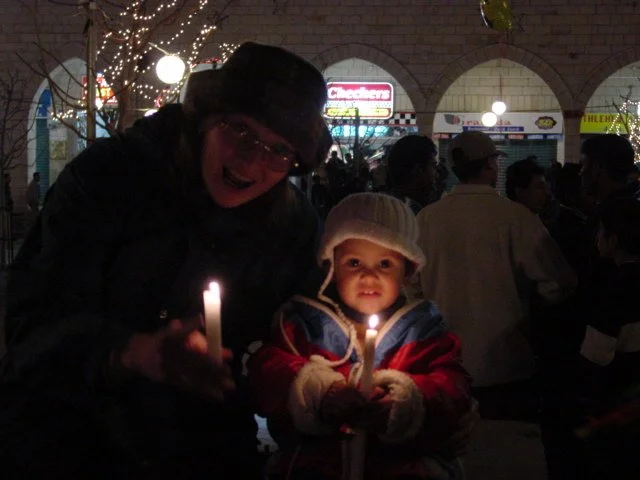 Elizabeth and a young Palestinian holding candles in Bethlehem’s Manger Square.