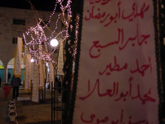 There was a memorial for the martyrs of the Intifada on trees around Manger Square, their names draped like Buddhist prayers and lit with simple white lights. We stayed until it got too cold, but numerous children - Christian and Muslim - made certain that we had adequate candlelight and welcome.