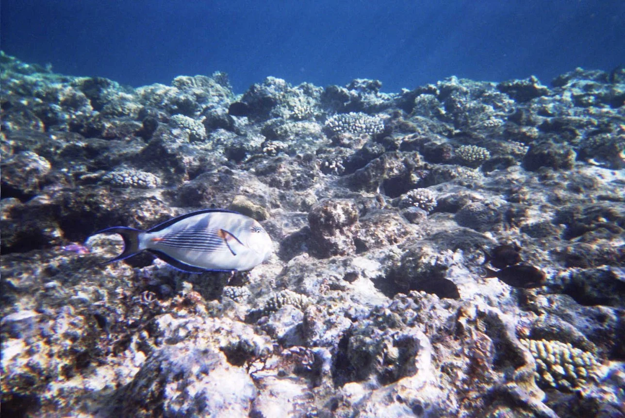 The late afternoon light came in at a spectacular angle, though it made spotting things a little more difficult. The calmness of the water gave us the chance to simply float, breathe slowly, and watch the spectacular parade pass beneath us. A surgeonfish, its whole body outlined with a magnificent neon blue stripe, swam nonchalantly nearby, knowing its beauty well enough to stop and pose for us. Not only did we marvel at the brightly colored parrotfish, but, as we came close enough, we also noted the crisp crunching sound they make as they chomp on coral. Considering how effortlessly they bit through rock-hard coral, we were glad they showed no interest in more fleshy, mammalian snacks. More butterflyfish darted here and there, as did damselfish and schools of striped sergeant majors.