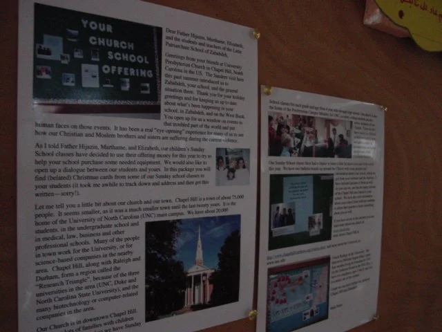 In comparison, we were floored to see that this new package made the trip from North Carolina to Jerusalem in a week. One of our stopping points this summer was University Presbyterian Church in Chapel Hill, North Carolina. Around Christmas time, they raised funds through their Sunday School to send a message of support, along with Christmas cards for the kids, to the Latin Patriarchate School here. Fr. Aktham went down to Jerusalem yesterday to try and get his visa renewed (unsuccessfully once again), and returned with the package for the school - Christmas cards and all.