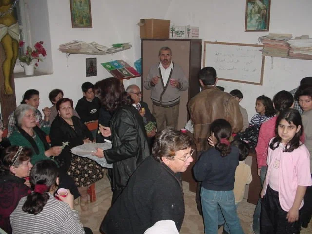 The faithful crowded in the small parish hall (work had begun in earnest on expanding, but stopped abruptly due to lack of funds) for food and fellowship. Fr. Thomas had prayed that morning in Tubas (three hours), their weekly prayer, then prayed for two additional hours in Zababdeh. Tomorrow he prays weekly prayer in Burqin, then Sunday in Zababdeh.