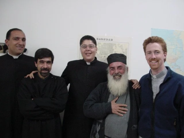 An ecumenical gathering in our Zababdeh home: Deacon Homam (Catholic), Fr. Firas (Melkite), Fr. Aktham (Catholic), Fr. Thomas (Orthodox), and Rev. Marthame (Presbyterian).
