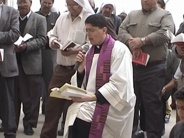Fr. Aktham kneels as part of the Stations of the Cross.