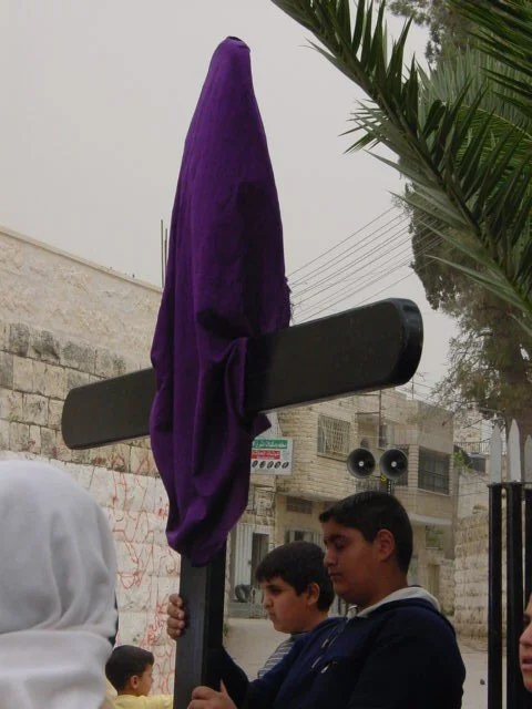 Our guests left early this morning back to Jerusalem to witness Holy Week and Easter events before returning to Gaza. Our schedule, however, doesn't let up. This morning, it was the Latin Church and their weekly Stations of the Cross service. All Lent it's been held inside the sanctuary. Today, it was held throughout the church's grounds. Kneeling on the asphalt became somewhat more optional than in the pews. This morning the hot dusty dry khamsineen winds were blowing (the name from the word for fifty, because the winds are so hot - think Celsius, Americans), making it, perhaps appropriately, a difficult desolate experience. Walking past the cemetery with a large windblown wooden cross under a darkened sky was quite powerful.