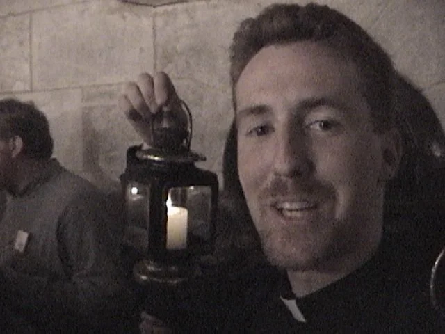 We got in our Catholic car, carrying our Orthodox lanterns, with Marthame wearing an Anglican robe loaned to him by the Melkite priest, and headed to Jerusalem. Jonathan, our friend from the University, joined for the drive. We took the video camera with us to document the trip.