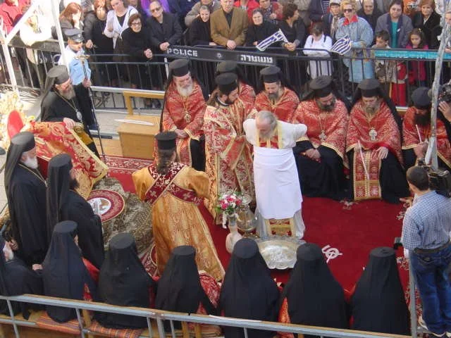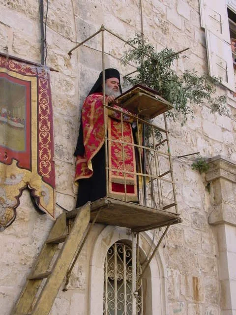 We left Nazareth at five in the morning to arrive in time for our first taste of Orthodox Holy Week festivities in Jerusalem. We entered Mar Yacoub (St. James) Orthodox Church, the Arab congregation of the Holy Sepulchre, named after the pillar of the Jerusalem church. As the faithful processed forward for the eucharist, preparations were being made for the Greek Orthodox liturgy of footwashing in the Courtyard of the Holy Sepulchre. Our friend rushed us up to the roof of the Greek Convent for a spectacular view of the raised platform - Patriarch Irenaeus and twelve priests and archimandrites entered from St. James' Church to the Yard. The liturgy calls for a retelling of the footwashing before the Last Supper. The Patriarch removed much of his more extravagant liturgical garb and tied a towel around his waist, kneeling down to wash the feet of the twelve "disciples." But for the two assistants doing much of the work, it was quite the image of service. Each of the "disciples" then posed a question to "Jesus", who responded in kind. Wish we could've understood the Greek.