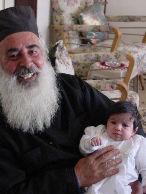 Following worship, we had lunch at his home. Fr. Aktham, the village mayor, as well as a representative of the Palestinian Legislative Council all came. Fr. Thomas' wife prepared msakhan, bread with olive oil, onions, sumac, and almonds. She said she prepared it because of us, knowing how much we like it. She's right! They also showed off their two-month old granddaughter.