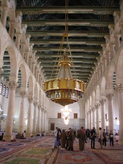Our last stop was the Ummayad Mosque in the middle of the Old City, a place which had once been a temple to Jupiter before it was turned into the Cathedral of John the Baptist. Outside are large, dramatic mosaics of natural scenes and geometric patterns. As we entered, the women in our group were provided with brown cloaks, a large group of Friar Tucks - a bit unpleasant in the heat. Once out of the sunshine and inside, we could see the old architecture of the cross-shaped church still evident, altered in order to turn it into a mosque. In the middle sits a green-gilded shrine which is purported to hold the remains of John the Baptist (there are several other churches which have similar claims). Elizabeth chatted with a group of women from Iran, and then had another chat with women from Iran. The mosque (and Damascus) seem to be a pilgrimage and tourist destination for Iranians. The ladies were tickled to meet a real American - we're something of a rarity in the Middle East these days.
