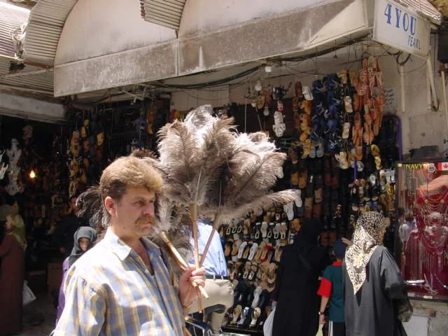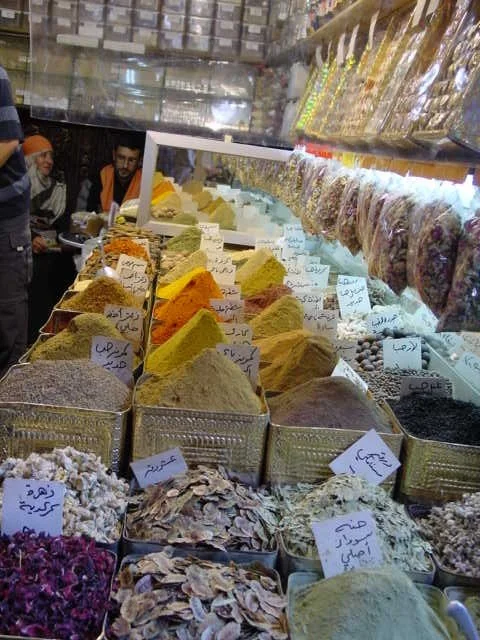 Elizabeth had no luck finding good leather in the souq, but she did find a delightful lacquer box salesman (where she bought Marthame's birthday present: a lovely inlaid backgammon/chess board) and then a delightful (and fluent English-speaking) silversmith. She also chatted with a spice salesman, who sold the familiar (cumin, rose petals, mint, chamomile) and the not so familiar (dried newts). He was full of information about what ailments each item could heal; people here still rely in large part on traditional medicine. She chatted with a man at the sweets shop, and bought a kilo of barezeq, a Damascene sesame specialty, for the teachers in Zababdeh when we return. At most of these stops, she was served tea - she felt like she drank six or seven glasses. Oh yes - and she had a liver sandwich from a little kiosk full of locals, tucked away in a corner of the textiles market.