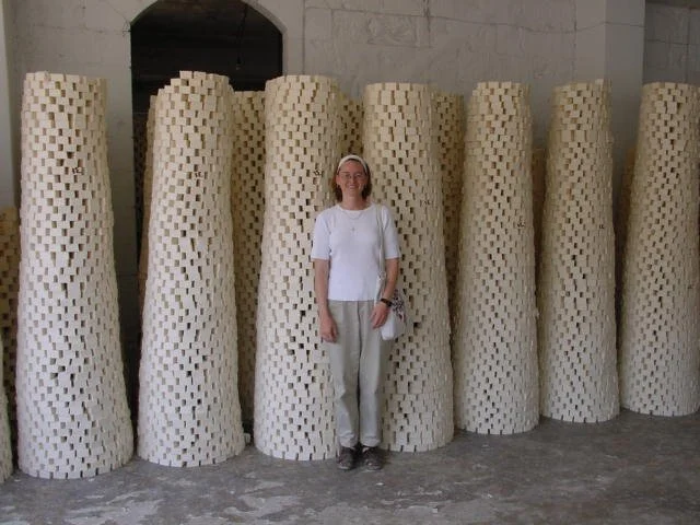 Elizabeth stands in front of towers of Nablus’ famous handmade soap.