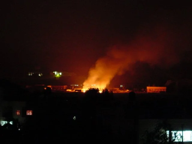 We then heard the sound of airplanes overhead - we assumed they were heading towards Jenin as they often do, but they kept circling overhead. For about half an hour, they were clearly concentrating on our valley, the one in which Zababdeh - and not much else - rests. Kinda makes you uneasy. We then noticed a fire burning in the distance, a big fire. Since it was night, we couldn't be sure where the fire originated, but it looked like it was coming from the IDF camp, or the boys' school nearby, or perhaps the gas station (there was no sound of explosion, but the fire was pretty high). Our minds ranged, wondering what it could have been - ignited by one of the flares? Something the planes did? Unlikely.
